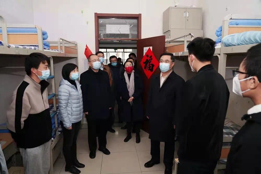 北区2号楼学生公寓楼,马连湘与现场师生亲切交谈互动,详细询问了学生的学习、生活、思想等情况,查看宿舍的防疫健康台账,检查色漫天堂