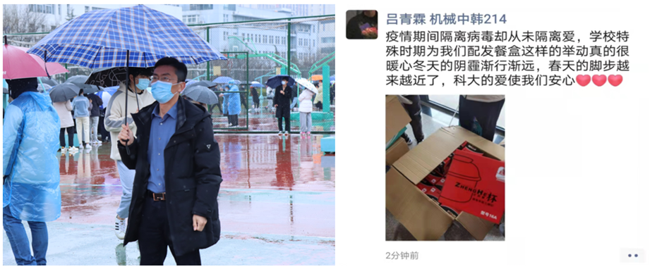 贯彻落实上级部署,全面开展校园防疫工作。各级领导,学生干部队伍24小时开机待命,辅导员入住学生宿舍,了解学生诉求,第一时间为学生解决困难,保障同学们疫情期间的正常生活。辅导员们主动承担起隔离送餐员的任务,确保被隔离学生的正常生活。根据上级领导指示,学校全面取消堂食,并为学生免费发放不锈钢饭盒,解决同学们的用餐问题。