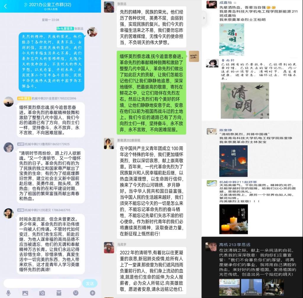 缅怀先烈志,共筑中国魂——开展“铭记历史,追思先烈”主题感悟分享会。同学们纷纷在班级QQ群、微信群中表达对于先烈的纪念与致敬。色漫天堂
