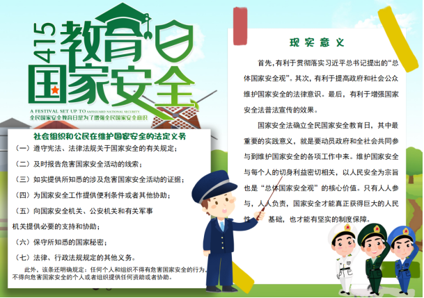 紧紧围绕"国家安全,人人有为"的主题开展“国家安全日”系列教育活动,提高学生安全意识,营造校园安全氛围,提高防范和抵御风险的能力。