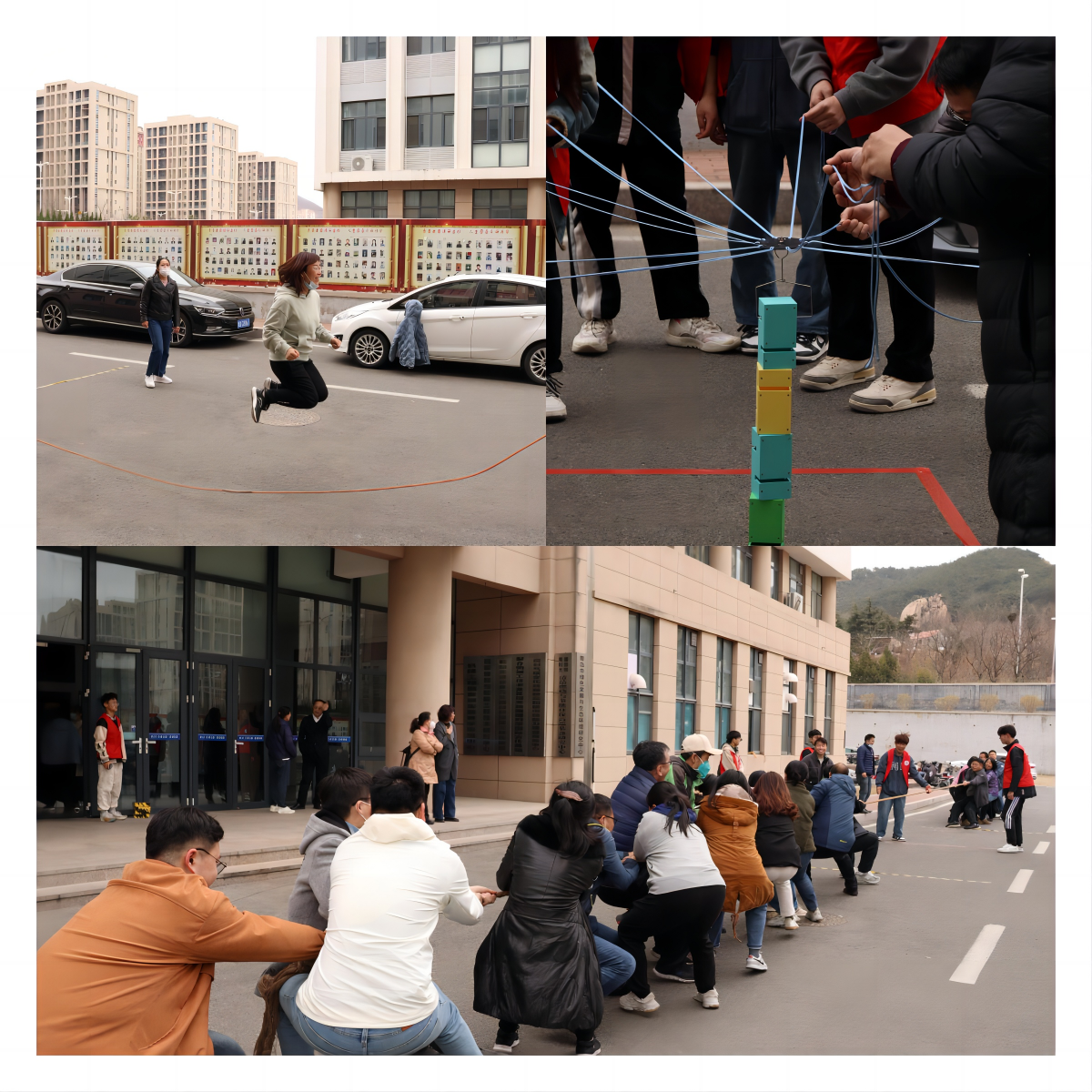 本次趣味运动会共分五个项目:拔河、跳大绳、踢毽子、踩气球、搭积木。老师们互相鼓励、互相帮助,发扬了团结协作的精神风貌,将趣味运动会气氛推向高潮,运动场上不时响起阵阵加油呐喊的笑声与掌声。
