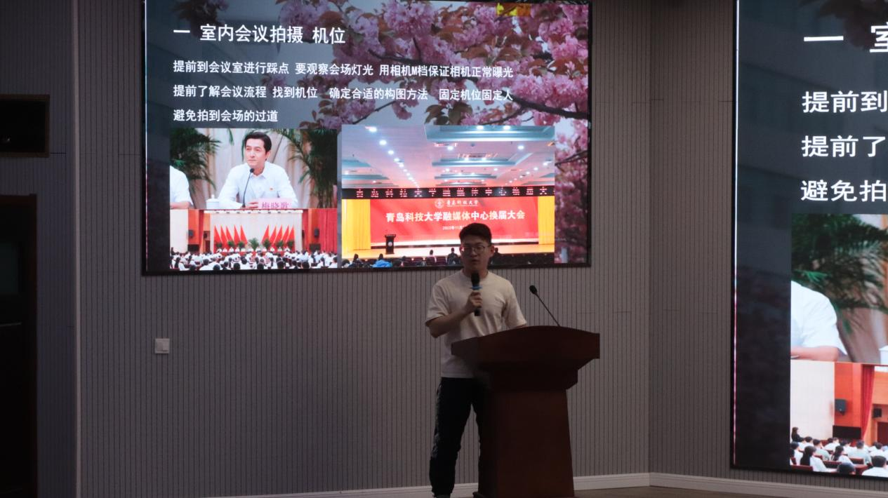 学校融媒体中心刘嘉洋就拍摄工作为同学们提供了切实可行的技巧建议。首先讲解了同学们有关拍摄机位的相关知识,随后展示会场拍摄、特写拍摄的技巧。最后讲解了照片的调整技巧及对照片的要求。