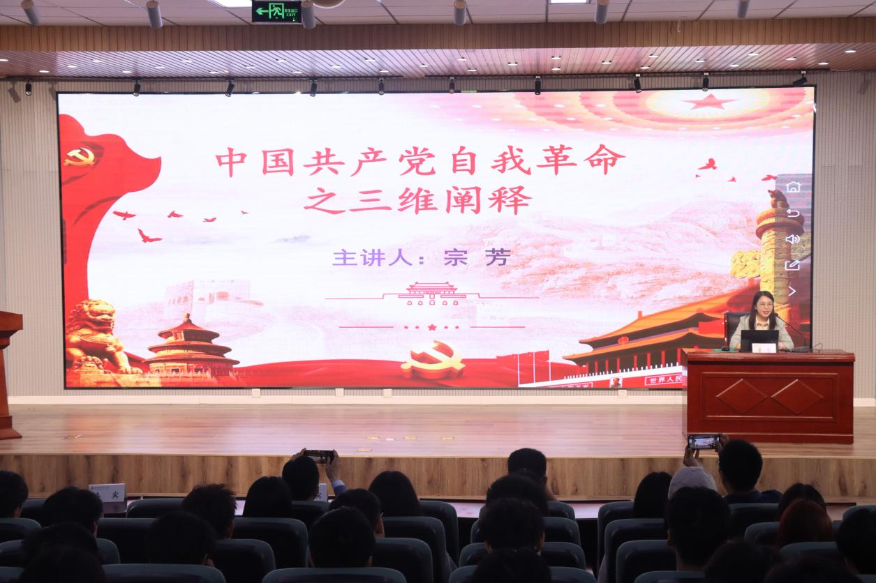 党史党建研究所所长宗芳作《党的自我革命的三维阐释》示范宣讲,从理论维度、历史维度、实践维度等三个维度对党的自我革命进行深刻解读,带领师生进一步学习贯彻习近平新时代中国特色社会主义思想。