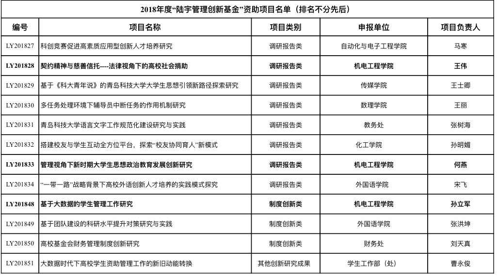 申报的项目《契约精神与慈善信托----法律视角下的高校社会捐助》、《管理视角下新时期大学生思想政治教育发展创新研究》和《基于大数据的学生管理工作研究》获学校 2018年度“陆宇管理创新基金”资助。