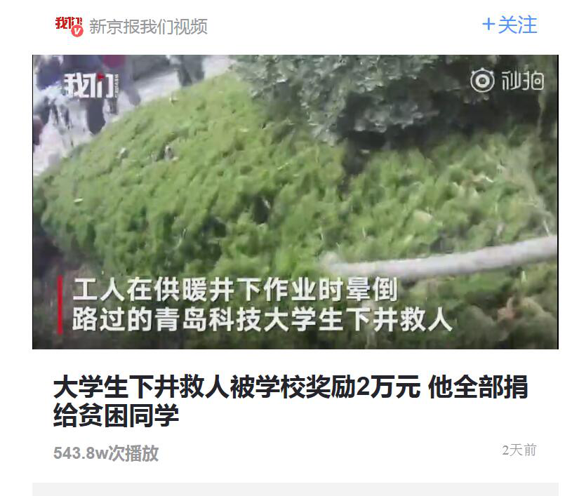 大学生下井救人被学校奖励2万元 他全部捐给贫困同学