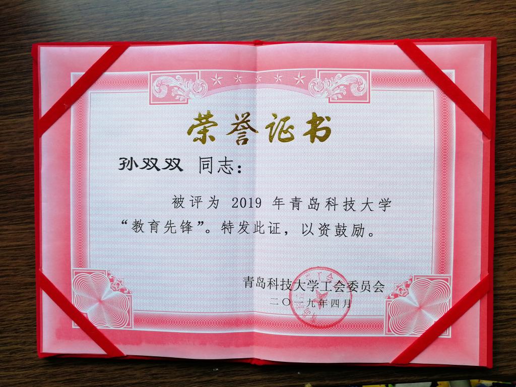 力学教研室荣获“青岛科技大学2019年教育先锋号”,孙双双教授荣获“青岛科技大学2019年教育先锋”。