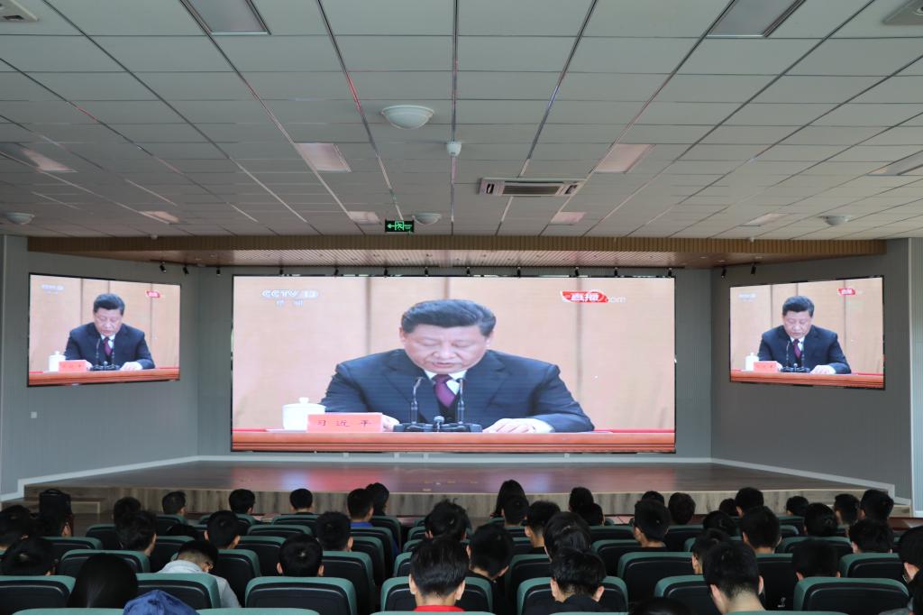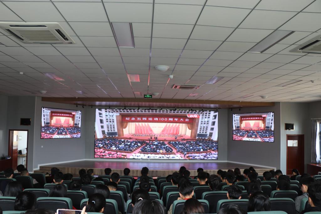 师生代表隆重集会,集体观看纪念五四运动100周年纪念大会。副院长郭建章、院党建组织员鲁伟、分团委书记王作辉等老师与机电优秀团学代表一起现场聆听了大会。