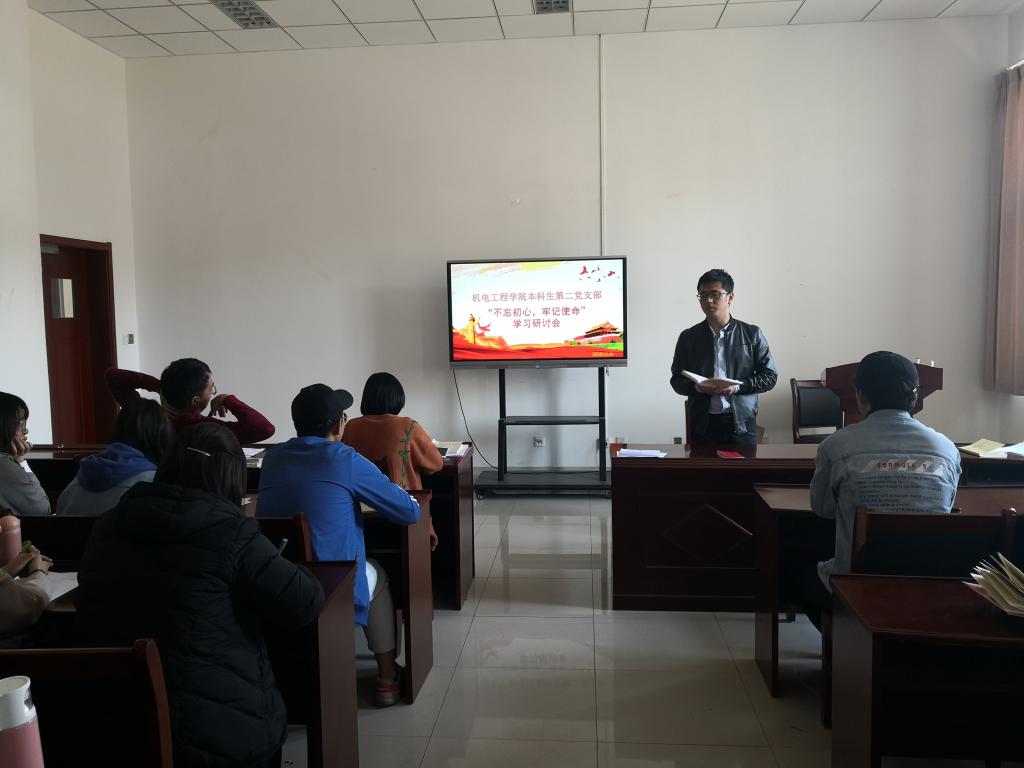 本科生第二党支部开展“不忘初心、牢记使命”主题教育集中学习研讨会,全体党支部党员参加了学习研讨,党支部书记曲智强主持学习研讨会。