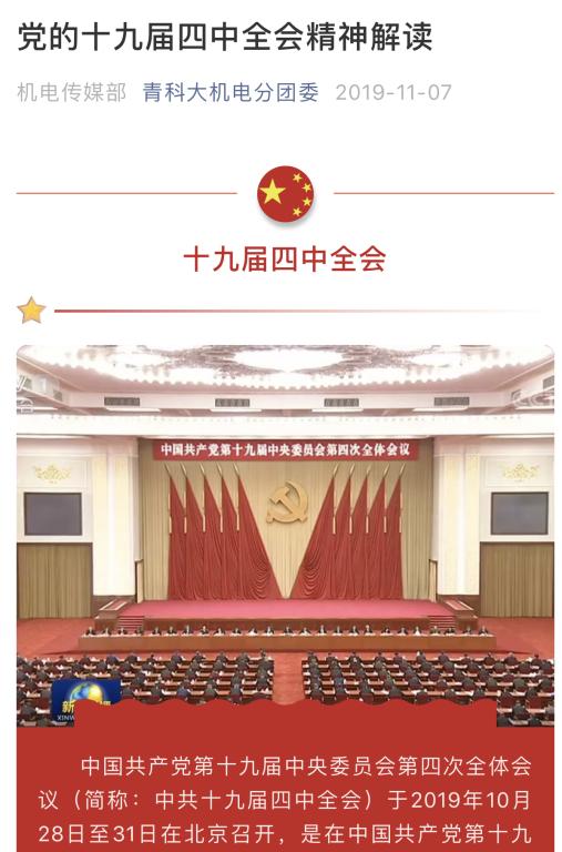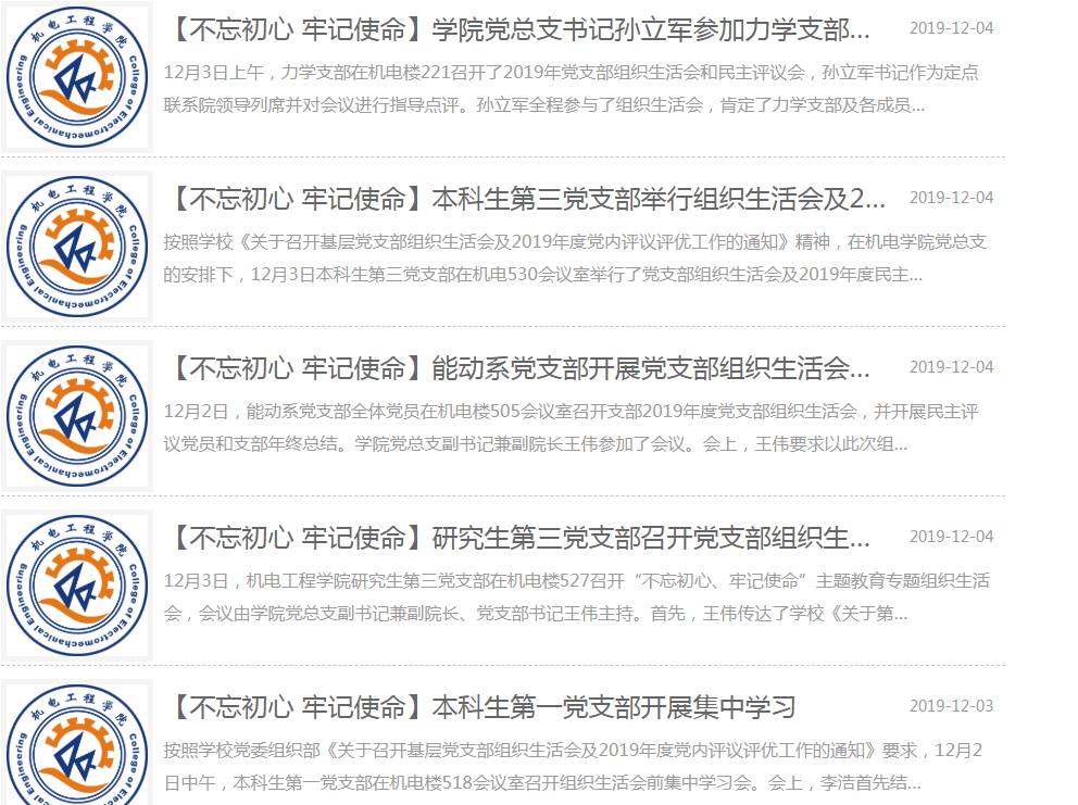 网站上开展“不忘初心、牢记使命”主题教育专栏,帮助青年大学生树立正确世界观、人生观、价值观,牢固树立“四个自信”,帮助学生党员不忘初心与使命,矢志不渝勤奋好学为民族国家奉献自身力量。设立“青春心向党 建功新时代”、“青马工程”、“青年讲师团”专栏,帮助广大青年团员以“五四运动”100周年为契机,在广大团员中营造奋发有为、勇于奉献的氛围。