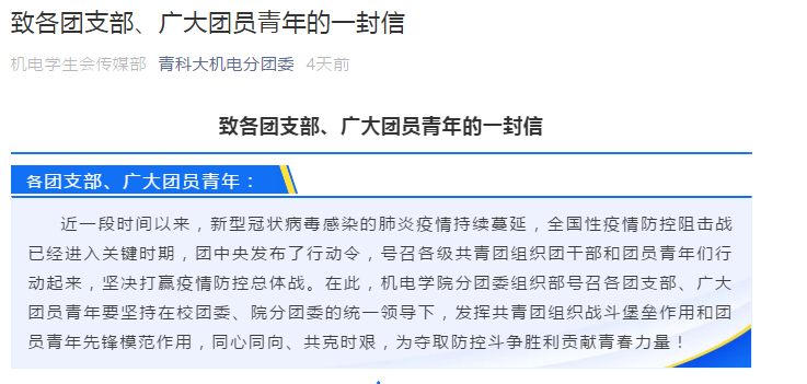 分团委组织部发表《致各团支部、广大团员的一封信》,号召各团支部、广大团员青年要坚持在校团委、院分团委的统一领导下,发挥共青团组织战斗堡垒作用和团员青年先锋模范作用,同心同向、共克时艰,为夺取防控斗争胜利贡献青春力量!号召机电学子服从指挥有纪律、正确发声有作为、履行职责有担当、网络学习由效率。机电色漫天堂