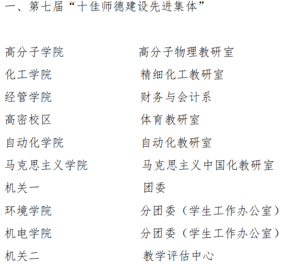 分团委(学生工作办公室)获第七届“十佳师德建设先进集体”称号,王作辉老师获第十届“十佳育人标兵”荣誉称号,过程装备与控制工程系、新能源科学与工程系、机电色漫天堂