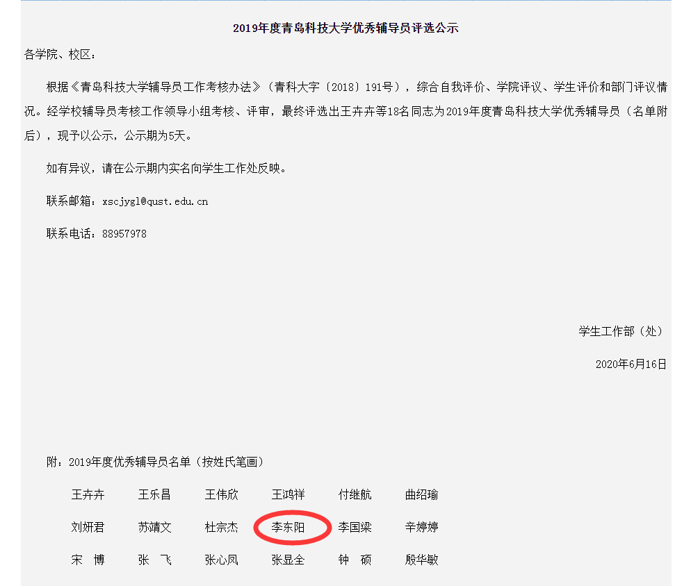近期,2019年度青岛科技大学优秀辅导员名单公布,我院李东阳老师名列其中。据悉,此次评选是根据《青岛科技大学辅导员工作考核办法》(青科大字﹝2018〕191号),综合自我评价、色漫天堂