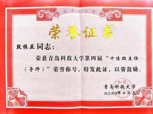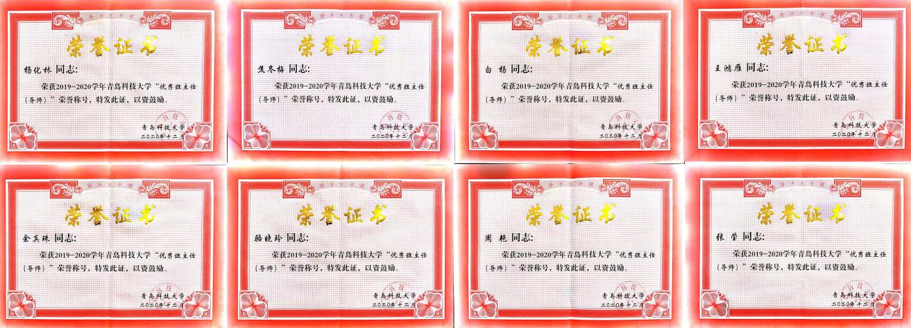 推荐,学生评议、网络投票和学校评审,学校共评选出十佳班主任10名、优秀班主任(导师)80名。其中,我院段振亚老师荣获青岛科技大学第四届“十佳班主任(导师)”荣誉称号;杨化林、焦冬梅、白杨、王鸿雁、余真珠、骆晓玲、周艳、张莹八名老师荣获青岛科技大学“优秀班主任(导师)”荣誉称号。
