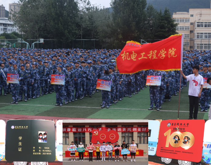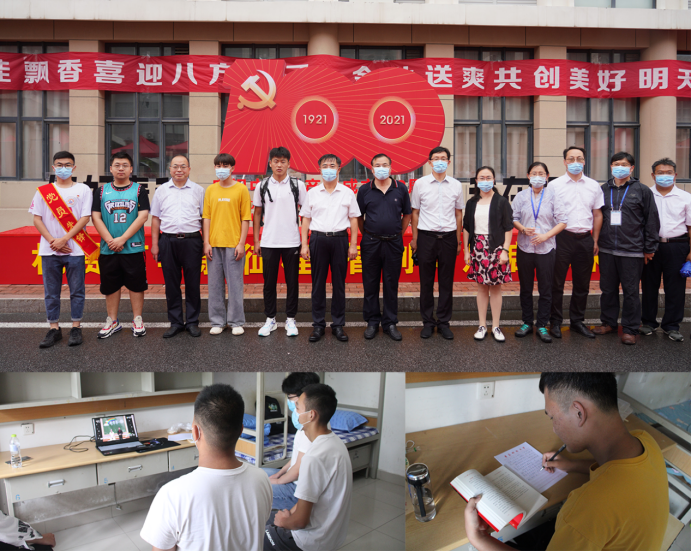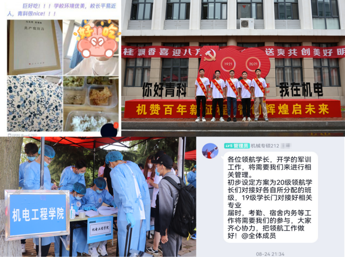 迎新工作。今年是中国共产党成立100周年,设置迎新红毯,学生经“机赞百年 智创辉煌”迎新拱门,来到建党100周年标志合影板。组织学生读《习近平与大学生朋友们》等书籍,观看《我和我的祖国》等影片,培养学生的家国情怀。