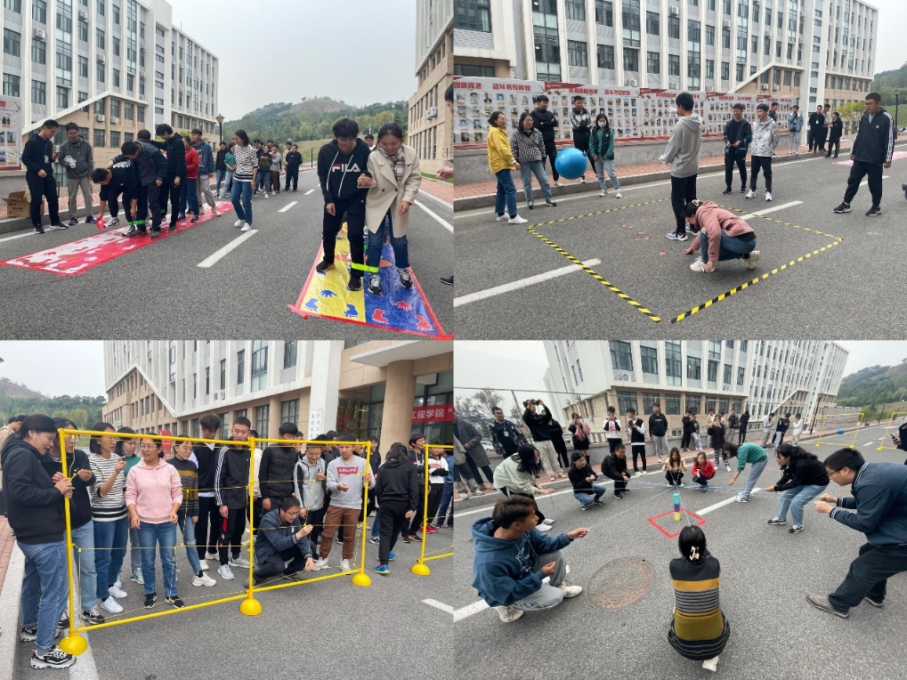的教师及学生代表参加了此次师生户外趣味运动会。活动共有四个环节:第一个环节是手脚并用,师生二人根据图标指示携手共同到达终点,考验师生间默契协作能力;第二个环节是躲避大摆锤,一人拿球空中旋转,各队10名师生代表参加,负重争夺物品,考验师生反应与速度;第三个环节是穿越电网,在全体对面面前悬挂一张“电网”,规定时间内,一次通过“电网”,考验团队协调管理、培养团队合作默契,以及提升工作效率;第四个环节是合力建塔,通过团队合作在规定时间内将盒子搭建起来,主要培养默契、加强沟通及强化执行。