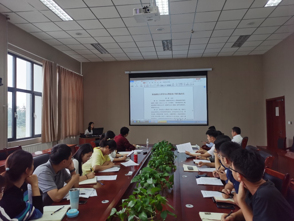 安全稳定和保护学生健康成长的基石,要丰富工作载体、拓展工作思路,并就抓实抓细学生心理健康工作,如何规范学生心理咨询与服务,更好适应和满足学生成长成才需求,保障学生心理健康与生命安全,提出六个方面的工作建议和要求:一是明确工作形势,提高思想认识;二是突出工作目标,注重预防干预;三是加强人文关怀,及时心理疏导;四是规范基础工作,强化履职尽责;五是推动信息共享,加强“校、院、班、舍”四级联动;六是开展心理研究,提升工作质量。会上,郭佩佩组织学习了《青岛科技大学大学生心理危机干预实施办法》等相关文件。