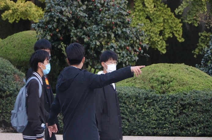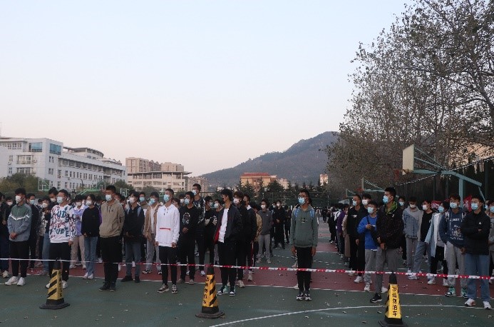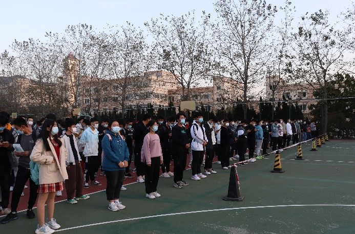 组织全体师生积极参与此次核酸检测实战演练,在短时间内将人员聚齐,紧张有序地在警戒线外等候。